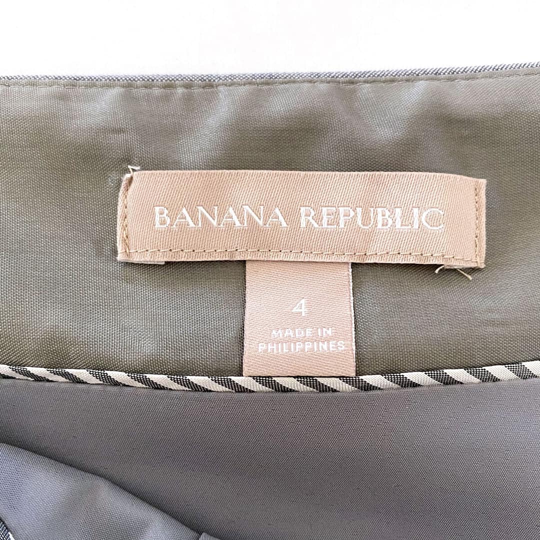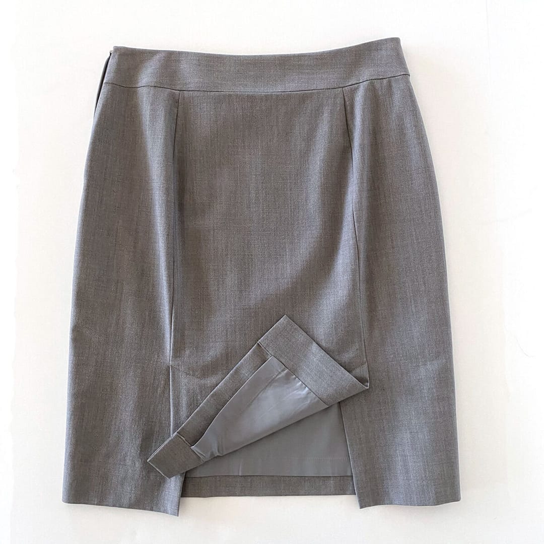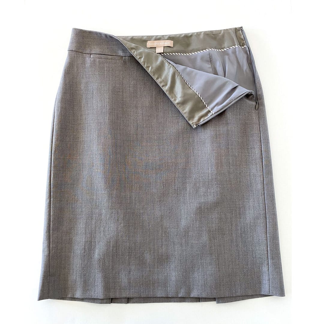 A timeless and versatile piece, this pre-loved Banana Republic pencil skirt is crafted from top-quality, all-season wool with a touch of stretch for comfort. The classic dove gray color and knee-length design make it a wardrobe staple. Functional details include an invisible side zip, hook-and-eye closure, and double back vents for ease of movement.