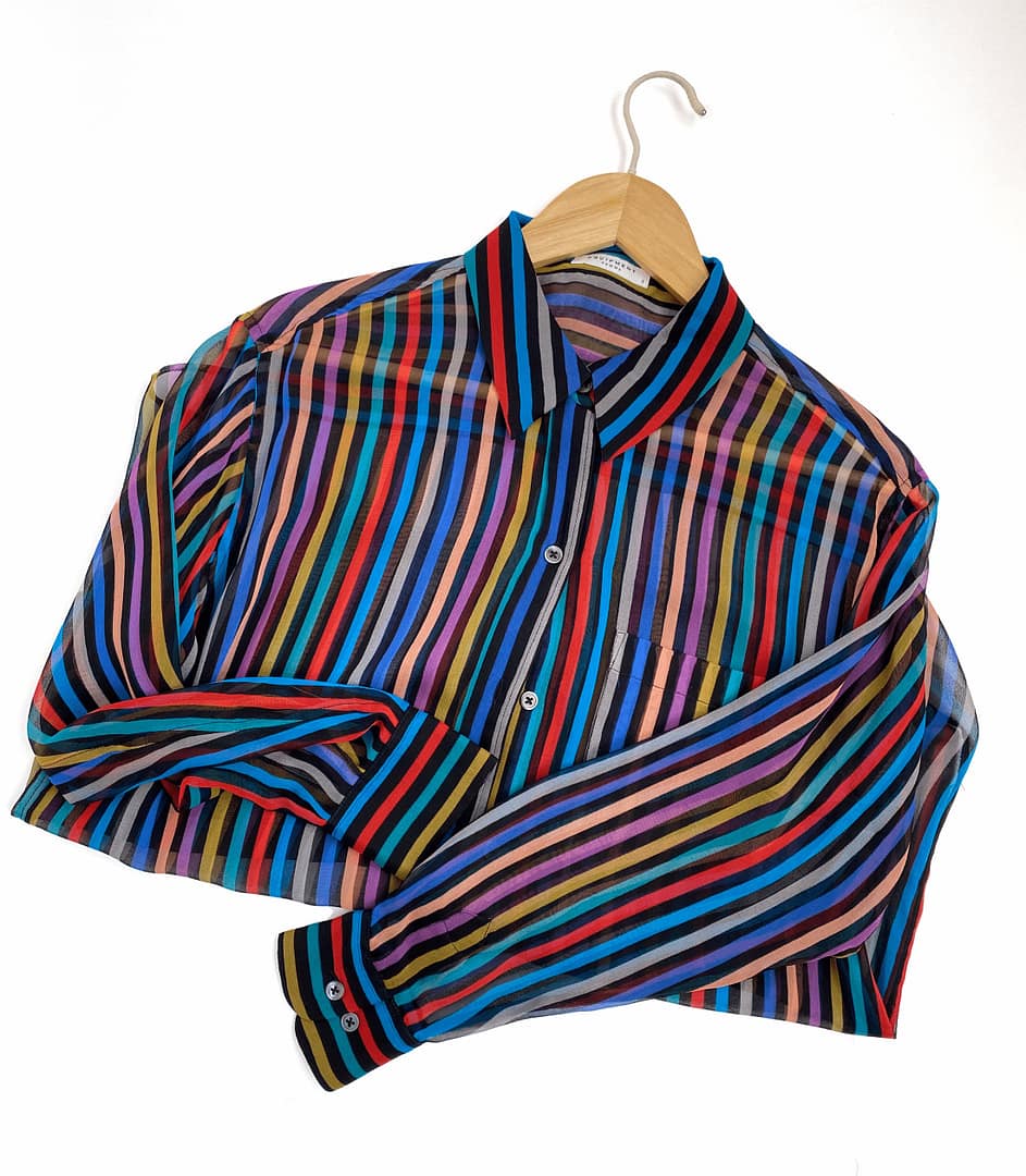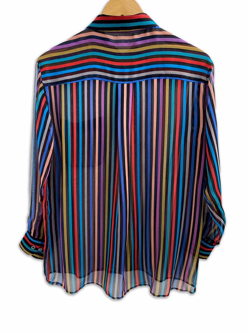 Embrace effortless French chic with this pre-loved vintage Equipment Femme silk blouse. This vibrant piece features bold vertical stripes on a black background, a relaxed fit, and sheer, featherweight material.